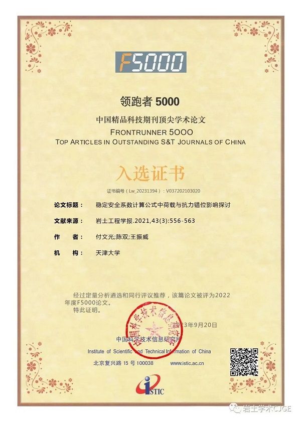 中國科學(xué)技術(shù)信息研究所發(fā)布了《中國科技期刊引證報(bào)告2023年(核心版)》,其中,總工程師付文光2021年以第一作者發(fā)表在《巖土工程學(xué)報(bào)》的論文《穩(wěn)定安全系數(shù)計(jì)算公式中荷載與抗力錯(cuò)位影響探討》,被評選為“中國精品科技期刊頂尖學(xué)術(shù)論文”(F5000)。