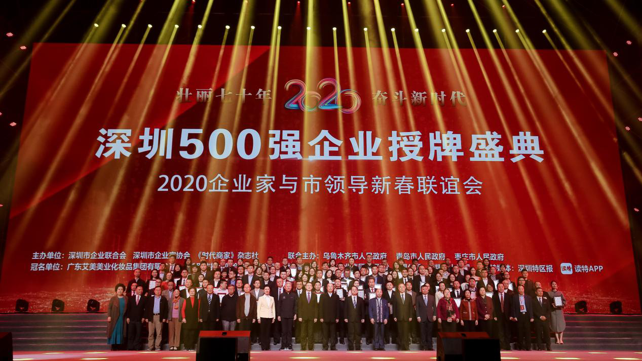 2019年12月10日,由深圳市企業(yè)聯(lián)合會(huì)、深圳市企業(yè)家協(xié)會(huì)、《時(shí)代商家》雜志社主辦的“深圳500強(qiáng)企業(yè)授牌盛典暨2020企業(yè)家與市領(lǐng)導(dǎo)新春聯(lián)誼會(huì)”在深圳灣體育中心“春繭”體育館舉行。深圳市人大常委會(huì)主任駱文智,市政協(xié)主席戴北方,中國企業(yè)聯(lián)合會(huì)、中國企業(yè)家協(xié)會(huì)常務(wù)副會(huì)長兼理事長朱宏任,深圳市委常委、統(tǒng)戰(zhàn)部部長林潔,副市長王立新及省市老領(lǐng)導(dǎo)等出席了盛典,并為“2019深圳500強(qiáng)企業(yè)”和“2019年度深圳市民營領(lǐng)軍骨干企業(yè)”授牌。